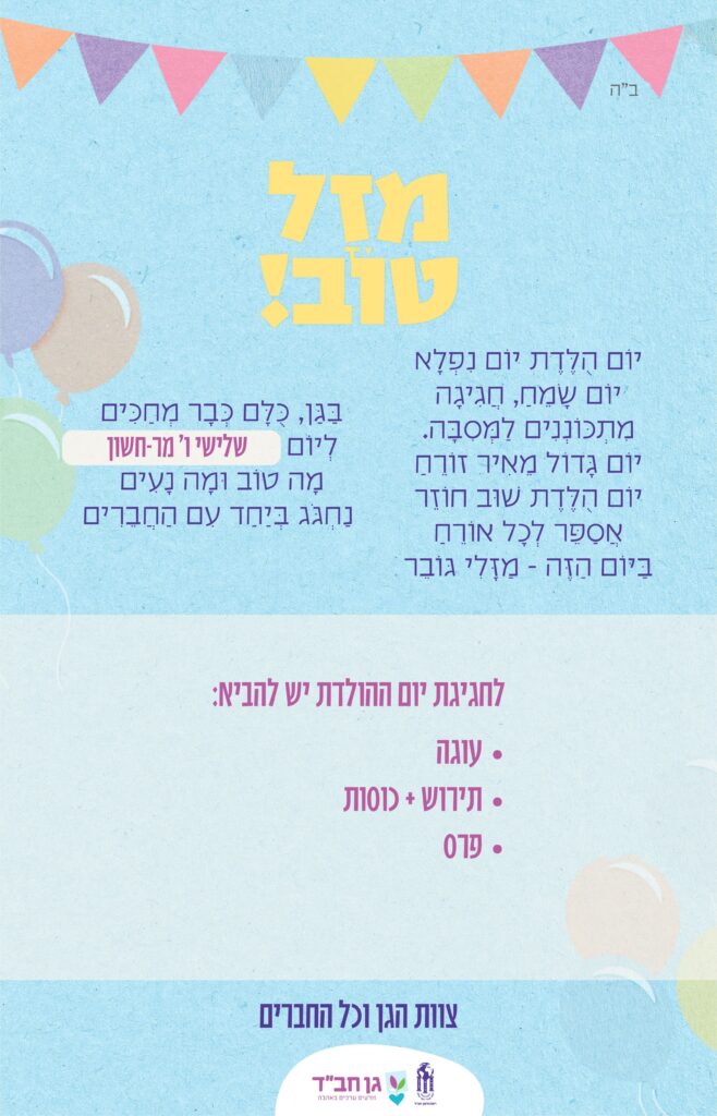 מעבר לחגיגה ולמתנות נבין בגן גם את המשמעות החשובה של יום ההולדת ואת דרכי ציונה בהודיה לקב"ה ובתוספת כוח בתורה, במצוות ובמעשים טובים.