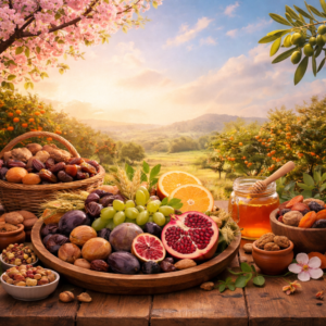 (אפשר לתאר גם את הפירות המיוחדים של ארץ ישראל בזמן ביקורם של המרגלים).